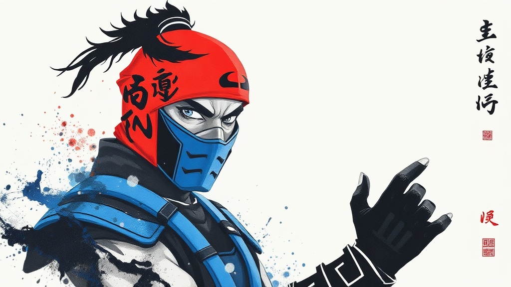 Sub Zero from Mortal Kombat portrayed in an ink artistic style, features bold typography elements, abstract design, utilizes complementary colors for dynamic contrast, emphasizes simplicity akin to Chinese painting, set against a white background, rendered in ultra-high definition 8k with subtle creative adjustments maintaining the essence.