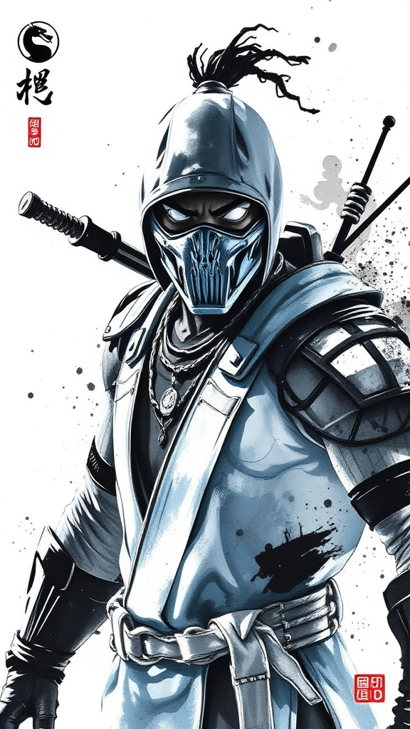 Sub Zero from Mortal Kombat portrayed with an ink artistic conception incorporating typography elements, abstract style with complementary colors, simplicity akin to Chinese painting, displayed against a white background, rendered in 8k resolution, enhanced with subtle creative twists while maintaining the core essence.