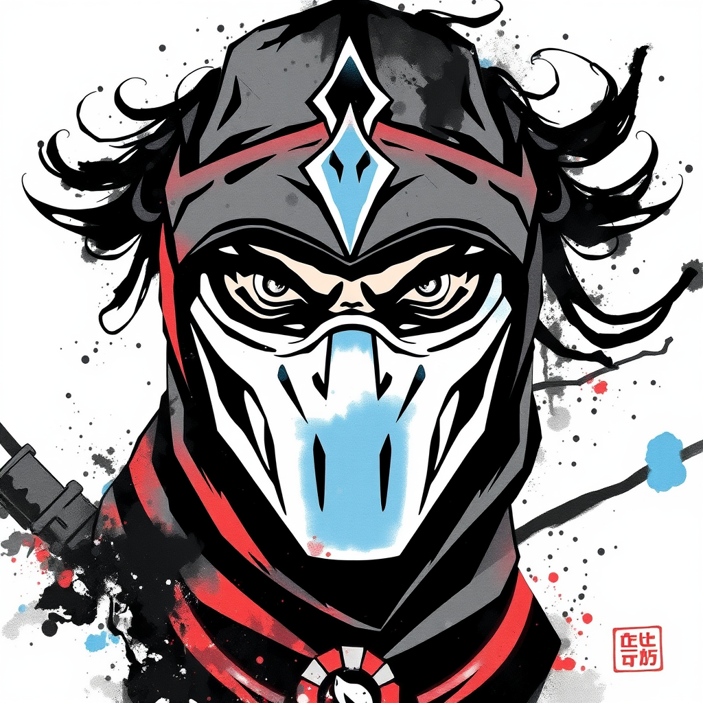 Sub Zero from Mortal Kombat reimagined in an ink artistic style, featuring bold typography elements and abstract design. The artwork makes use of complementary colors and emphasizes simplicity, drawing from Chinese painting techniques on a pristine white background. The composition is rendered in high resolution, capturing an 8k level of detail.