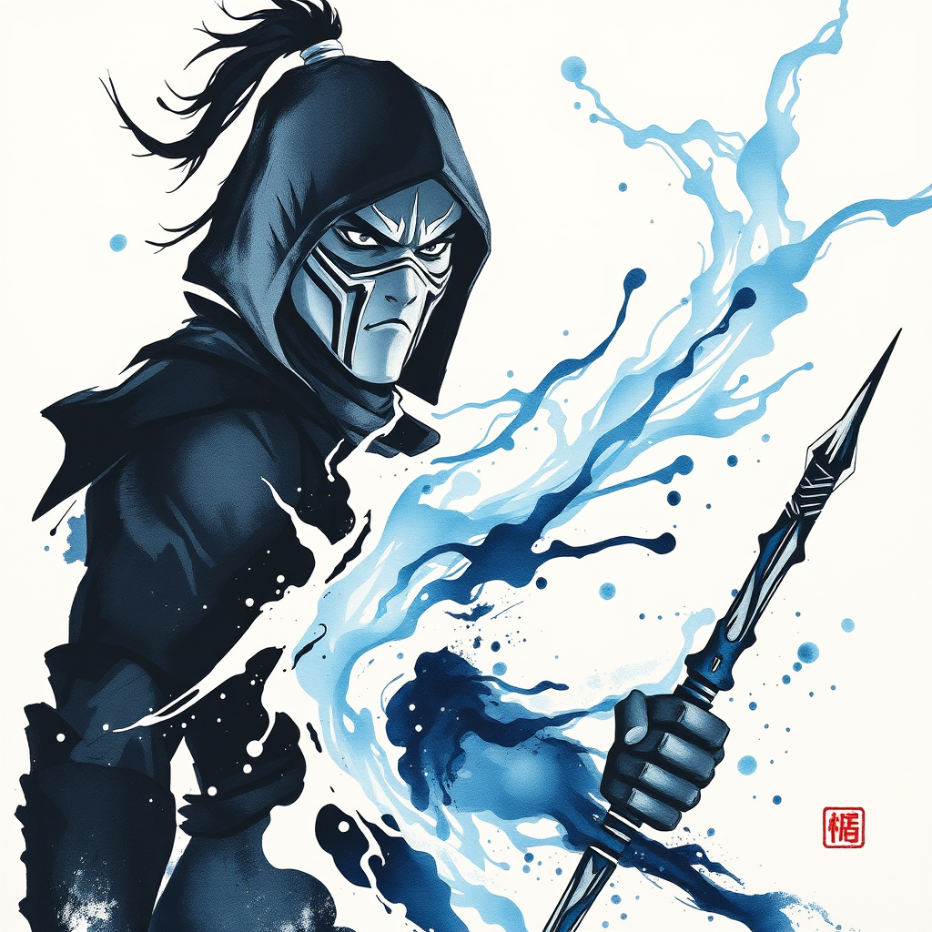 Sub Zero from Mortal Kombat reimagined in an ink artistic style, featuring dynamic typography elements intertwined with abstract forms, utilizing complementary colors in a minimalist composition. Inspired by traditional Chinese painting on a white background, the design captures fluid motion and icy essence in stunning 8k detail, with subtle creative variations adding a unique touch.