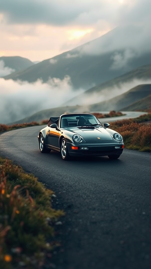 SUBJECT: 1995 Porsche 911 ADJECTIVES: Iconic, deep black with subtle silver highlights, immaculate AMBIENCE/ENVIRONMENT: Dawn on a serpentine road, shrouded in mist with glistening grass LOCATION: Coastal mountain landscape IMAGE STYLE: Dramatic editorial photography with a retro atmosphere, captured in 4K ARTISTS: Jeff Zwart TAGS: Realistic, outstanding quality, 4K, vintage automobiles, Porsche 911, editorial photography