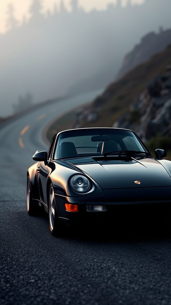 SUBJECT: 1995 Porsche 911 ADJECTIVES: Timeless elegance, sleek black with gleaming silver accents, immaculate AMBIENCE/ENVIRONMENT: Dawn on a winding road, enveloped in ethereal mist and glistening morning dew LOCATION: Rugged coastal mountain landscape IMAGE STYLE: Moody editorial photography with a nostalgic vintage aura, captured in 4K ARTISTS: Jeff Zwart TAGS: Lifelike, exquisite quality, 4K, iconic cars, Porsche 911, editorial photography