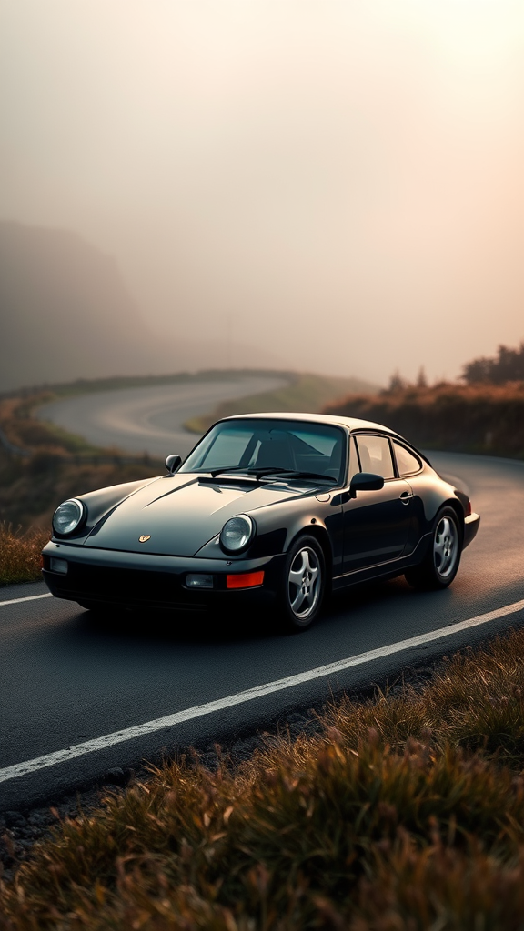 Subject: 1995 Porsche 911 with a timeless allure, bathed in a sleek black hue enhanced by subtle silver accents, presented in pristine condition. The scene unfolds in the early morning on a winding coastal mountain road, shrouded in a mystical mist and flanked by dewy grass. The ambiance captures a sense of serene adventure. Image style is moody, evoking editorial photography from a bygone era, yet captured in pristine 4K. Artists such as Jeff Zwart inspire this vision, with tags including realistic, superb quality, 4K, classic cars, Porsche 911, and vintage editorial photography.