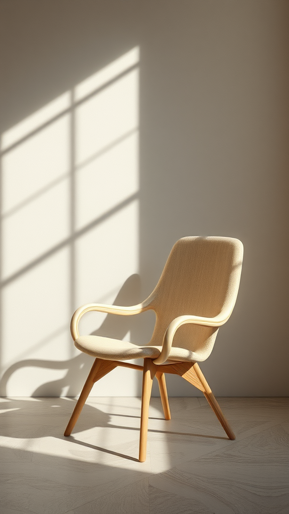 Subject: A chair design subtly drawing inspiration from the harmonious architecture of beehives, Style: Japandi fusion, Photography: high-quality furniture photography, Lighting: naturalistic shadows and lifelike lighting, incorporating gentle reflections, Colors: muted pastel palette, Settings: aspect ratio 2:3, with faint artistic tweaks to retain originality while showcasing its core elegance.