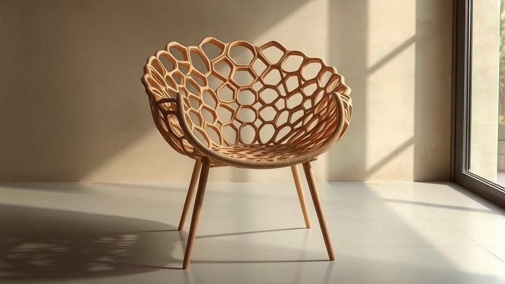 Subject: A chair designed with the essence of beehives, embodying the Japandi style, captured with an emphasis on furniture photography in mind. Lighting focuses on realistic shadows, authentic lighting, and true-to-life reflections, utilizing a palette of gentle, muted color tones in the composition. Envisioned in a setting with a 2:3 aspect ratio, the chair captures a harmonious blend of nature-inspired geometry and minimalist elegance.