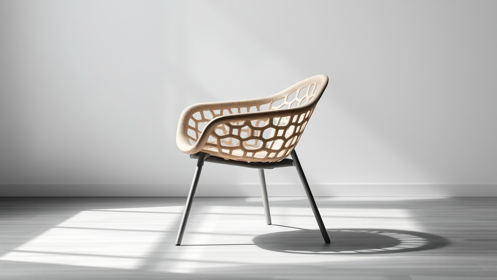 Subject: A chair drawing inspiration from the natural geometry of beehives, Style: A harmonious fusion of Japanese minimalism and Scandinavian functionality, Photography: expert furniture photography capturing every angle, Lighting: subtle interplay of realistic shadows and authentic lighting, delicate reflections enhancing the piece, Colors: gentle and soothing monochrome palette, Setting: showcasing the chair in a serene, uncluttered environment with an aspect ratio of 2:3, refining the elegance of the design with a touch of creative warmth while retaining its core essence.