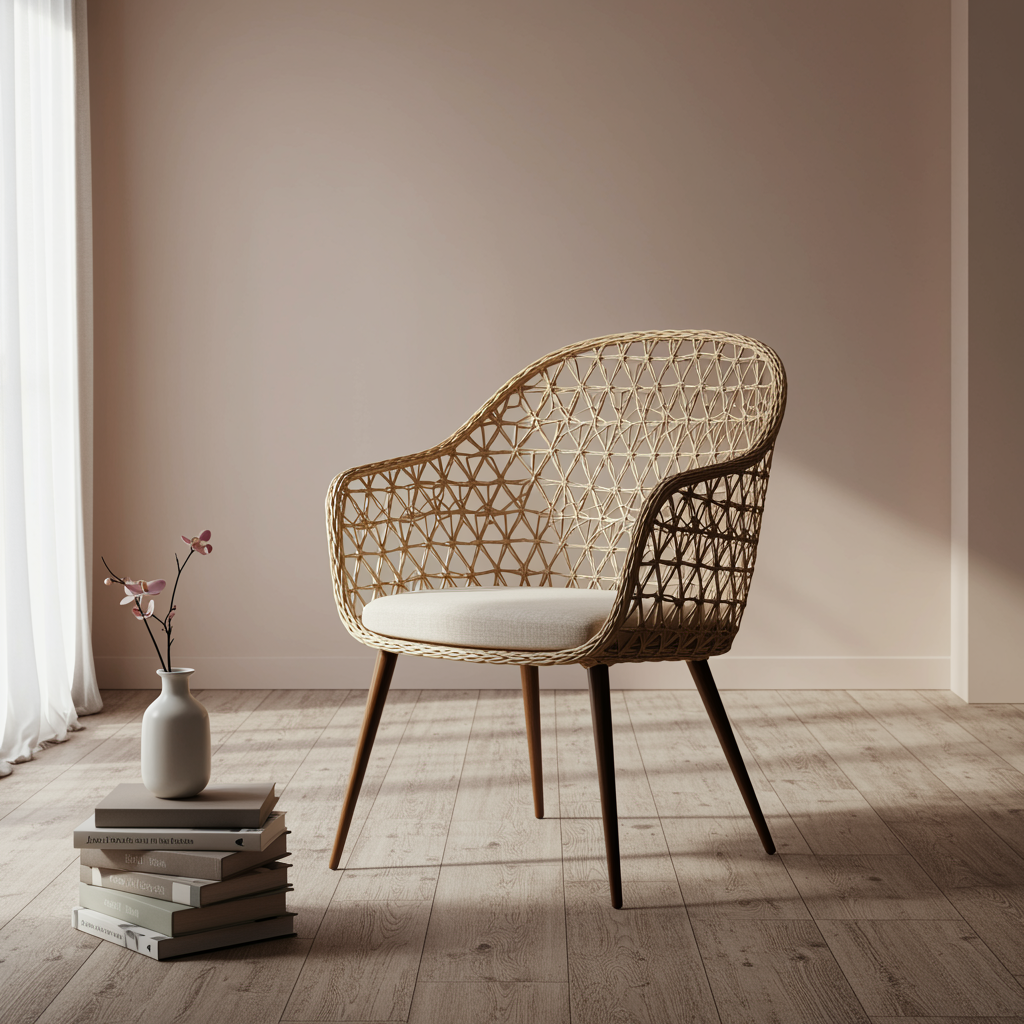 Subject: A chair taking cues from the intricate shape of beehives, Style: Japandi with a minimalist twist, Photography: high-end furniture photography, Lighting: natural shadows, authentic lighting, gentle reflections, Colors: calming pastel tones, Settings: aspect ratio 2:3, Environment: serene and uncluttered space suggesting a blend of Scandinavian and Japanese aesthetics.