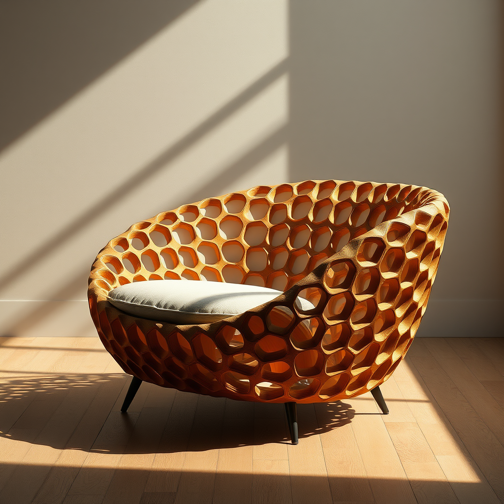 Subject: A lounge chair influenced by the geometric elegance of honeycombs, Style: Japandi fusion, Photography: high-end furniture photography, Lighting: natural shadows, lifelike illumination, subtle reflections, Colors: muted earth tones, Settings: aspect ratio 2:3.
