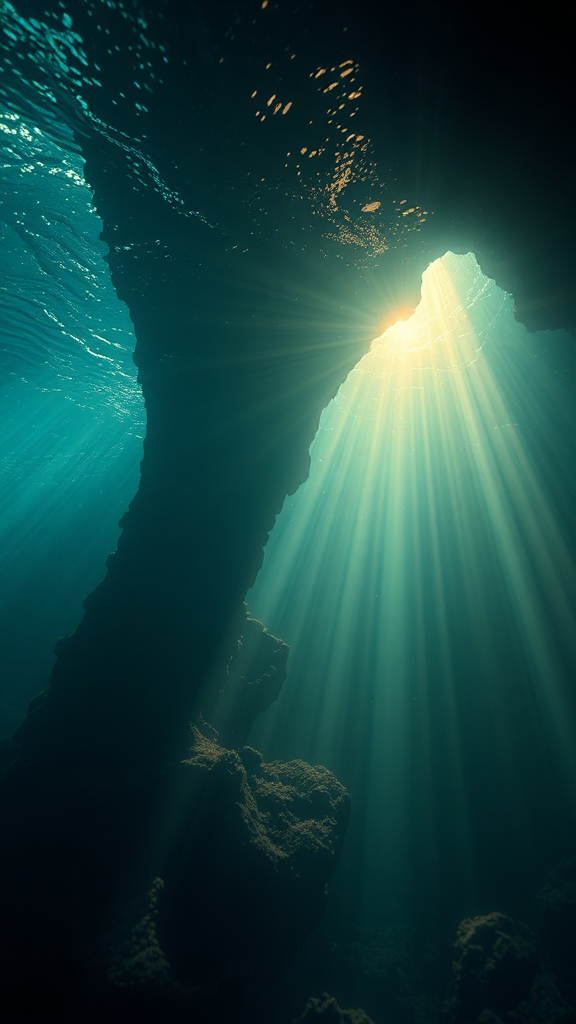 Submerged: Atlantis, shimmering caustics and Snell's window, ethereal god rays, remnants of a lost world, breathtaking still image, filmic lighting, vivid color grading, cinematic aura, exquisite masterpiece, complex, highly detailed animated art, gentle blur, abstract forms, 3D rendered, Blender artistry.