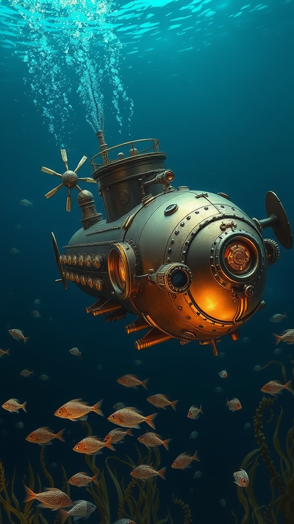 Submerged in the deep blue depths, a magnificent steampunk submarine named the Nautilus glides gracefully, its brass and copper hull gleaming under the muted underwater light. Propellers spin silently, leaving trails of gentle bubbles in its wake. Ornate portholes cast a warm glow from the interior, hinting at the mysterious adventures within. Elaborate gears and mechanical appendages adorn its sides, adding to its fantastical charm. Schools of curious fish swim alongside, their scales shimmering like jewels against the submarine's intricate design, as seaweed sways rhythmically in the ocean current.