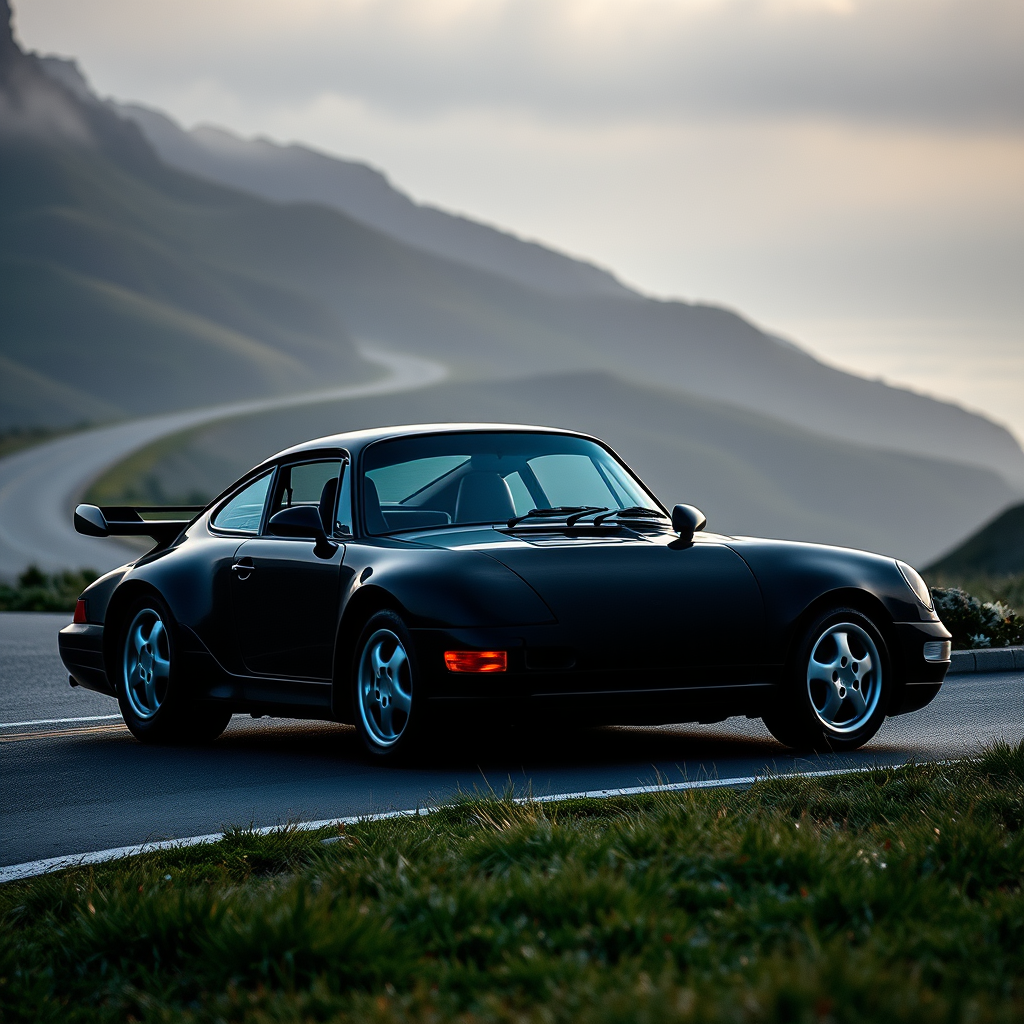 Subtle dawn light casts a moody elegance over a 1995 Porsche 911, its timeless design highlighted by black and silver accents. The car sits in pristine condition, poised on a winding road that snakes through a coastal mountain range. Misty fog drifts softly between the peaks, and dewy grass glistens in the early morning light. This scene exudes the essence of classic automotive beauty, captured in rich, vintage-inspired 4K editorial photography. Renowned for his iconic imagery, Jeff Zwart's influence is evident, bringing out the realistic and superb quality of this classic masterpiece. Tags include: classic cars, Porsche 911, vintage photography, mountain roads, serene morning.