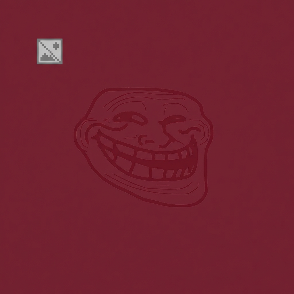 A minimalist image featuring a faint, barely visible trollface meme embedded in a solid maroon background. A small, pixelated broken image icon is present in the top left corner, adding a touch of digital glitch art.