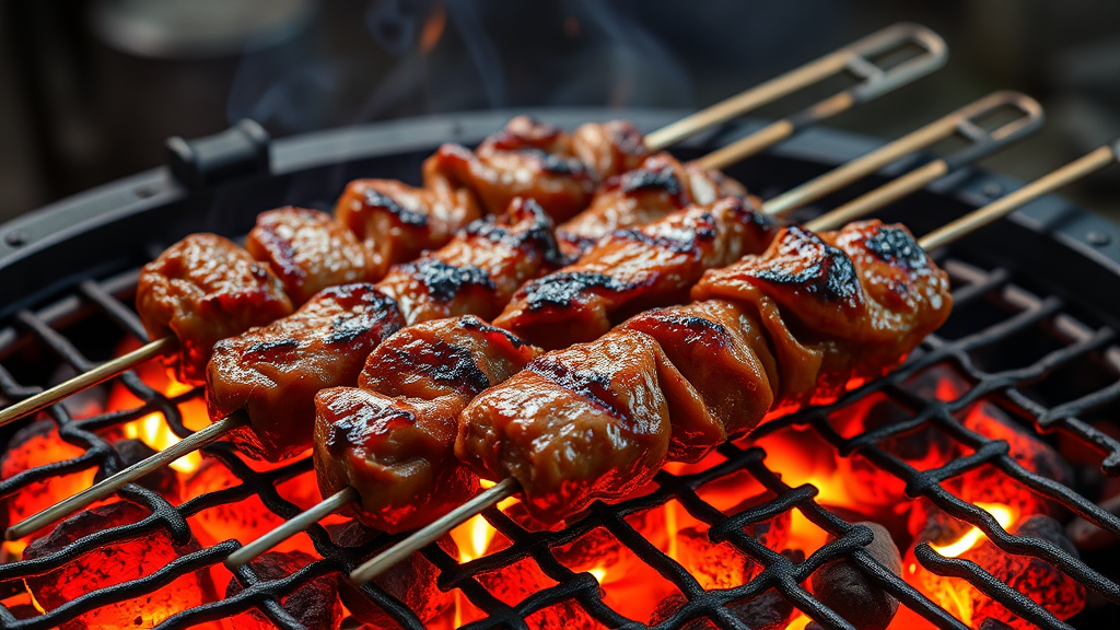 Succulent grilled meat skewers sizzle enticingly on a barbecue grill, surrounded by glowing hot coals and flickering orange flames. The scene conveys mouthwatering aromas and savory textures, captured with photorealistic precision and studio-quality lighting, highlighting every juicy detail and tender piece of meat against the rustic backdrop of the grill.