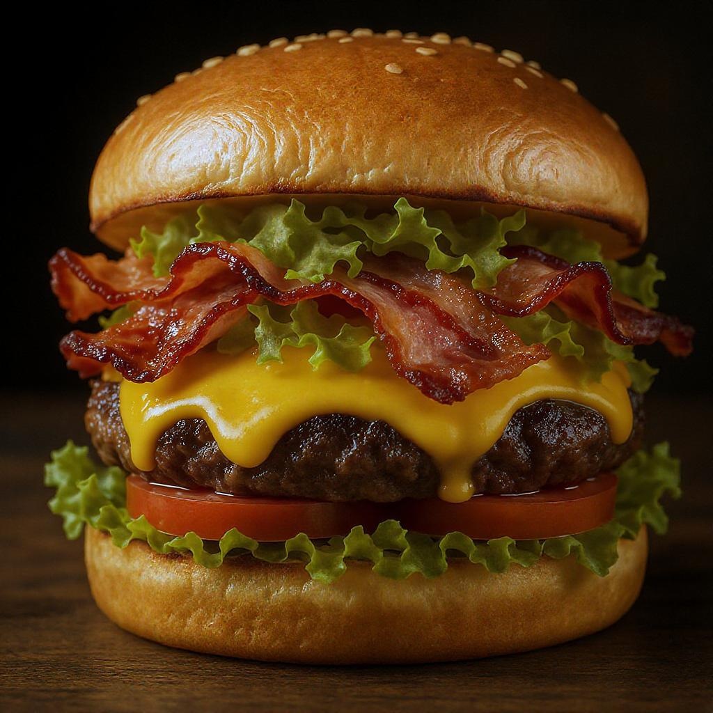 Succulent hamburger featuring crispy bacon, fresh lettuce, ripe tomato, and melted cheese; high-definition promotional image showcasing the product in vibrant full color with an ultra-realistic render that captures the tempting essence of this mouthwatering creation.