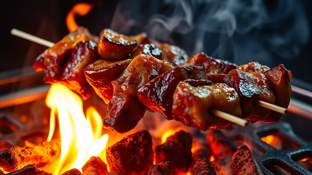 Succulent pieces of marinated meat threaded onto skewers sizzle enticingly over glowing hot coals, with flickering tongues of flame dancing upwards. Each skewer is laden with juicy, caramelized morsels, their surfaces glistening as the heat coaxes out rich aromas. The scene captures the essence of food photography at its finest, merging photorealism with intimate studio lighting to highlight the textures and colors of the perfectly grilled meat. A hint of smoky haze lingers over the grill, enhancing the mouthwatering allure and anticipation of a delicious meal.