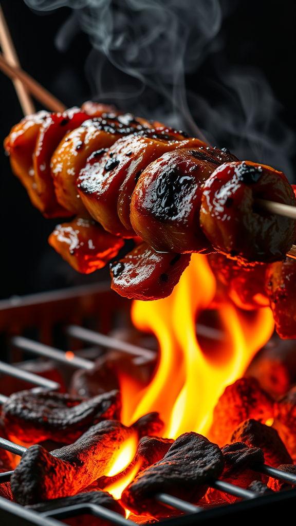 Succulent skewered meats sizzle enticingly over a barbecue grill, their juices dripping onto the glowing hot coals below, sending up delicate wisps of smoke and tiny flickering flames. Captured with photorealistic precision, every detail shines in this studio-shot masterpiece of culinary artistry, highlighting the charred edges and glistening glaze that hint at smoky, savory flavors within.