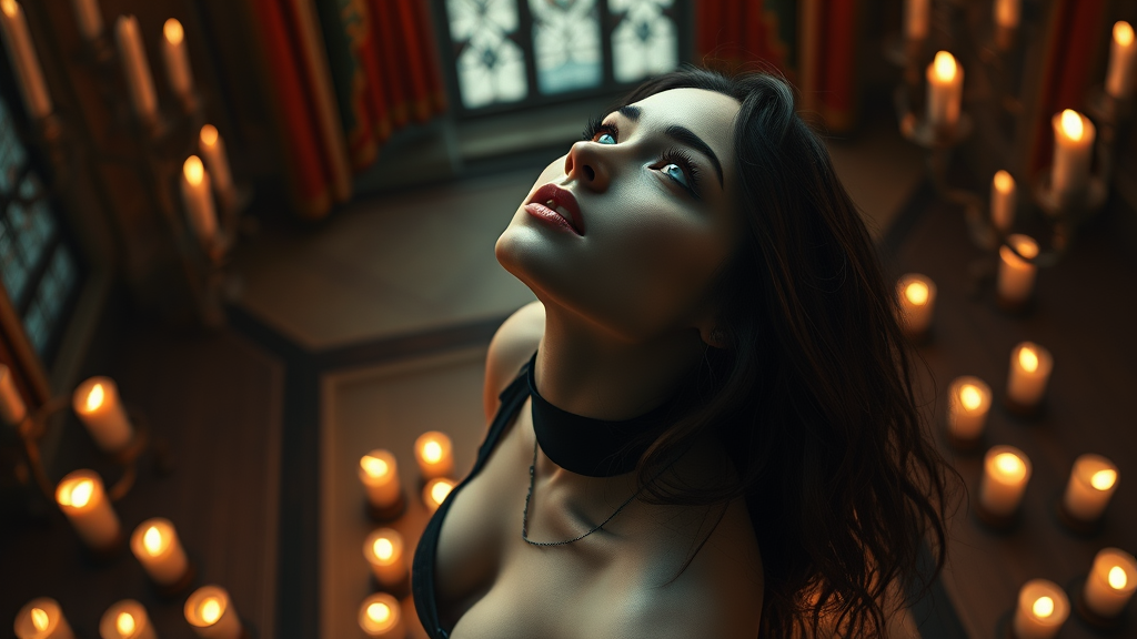 Sultry close-up of a ravishing young woman donning an edgy gothic ensemble and a revealing thigh-high skirt, gazing skyward with an alluring, whispered-secrets expression, as seen from a top-down perspective, amidst a stark, church votive stand-choked set, infused with rich, dramatic lighting, rendered in surreal, advanced Unreal Engine 5, and captured with breathtaking photorealism and the depth-defying precision of RTX ray tracing