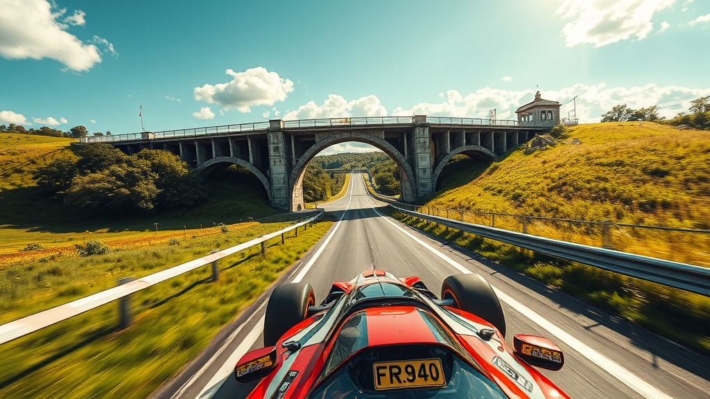 Summer. A racecourse stretches across a field and ascends to an Arched Bridge over a small river. The lead vehicle STARTS climbing up onto the bridge. Horror! A gap in the racecourse! No other bridges are in sight. Ahead of the lead race car, a large chasm looms. Beyond the bridge, the track disappears out of view. The camera angles from behind and slightly to the side of the vehicle. The racetrack is bathed in bright sunlight. Style – cyberpunk.