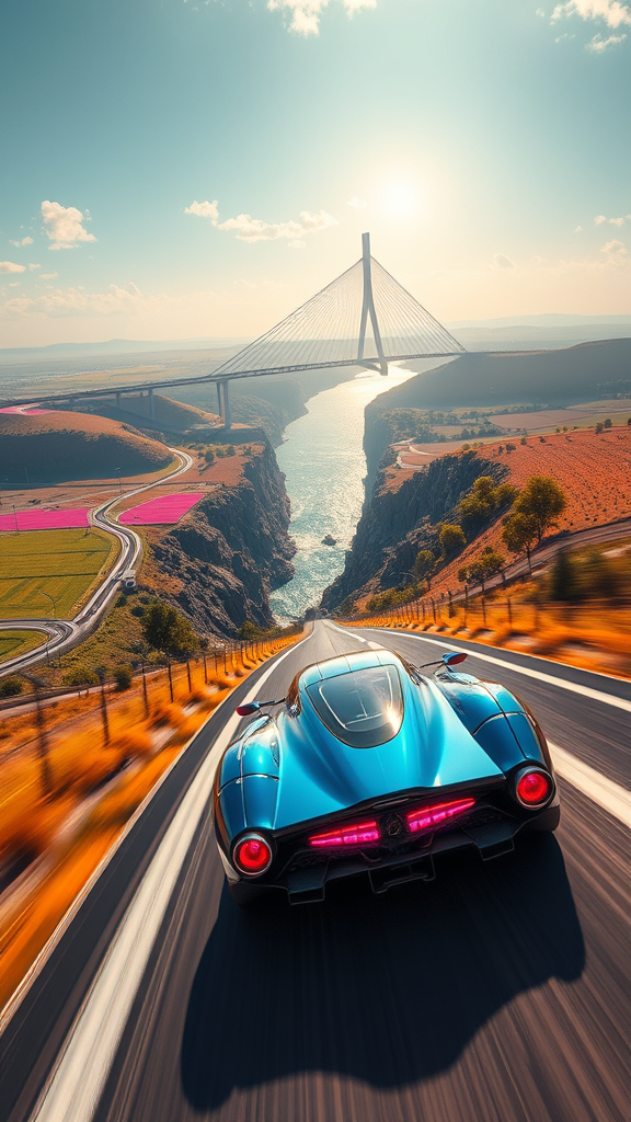 Summer afternoon, the racing track winds through neon-lit fields and ascends toward the sleek, iridescent structure of the Convex Bridge spanning over a narrow, glistening river. The lead car, a futuristic marvel of chrome and electric hues, begins its ascent onto the bridge. Suddenly, a jolt of horror as disaster strikes; a gaping chasm yawns open on the track ahead, swallowing any hope of a clear path forward. No alternate routes or safety nets appear in the high-tech landscape. The scene captures the tension from a dynamic angle just behind and slightly to the side of the speeding car, steering into uncertainty. Sunlight floods the landscape, casting sharp shadows and illuminating the vibrant, cyberpunk aesthetic of the synthetic horizon.