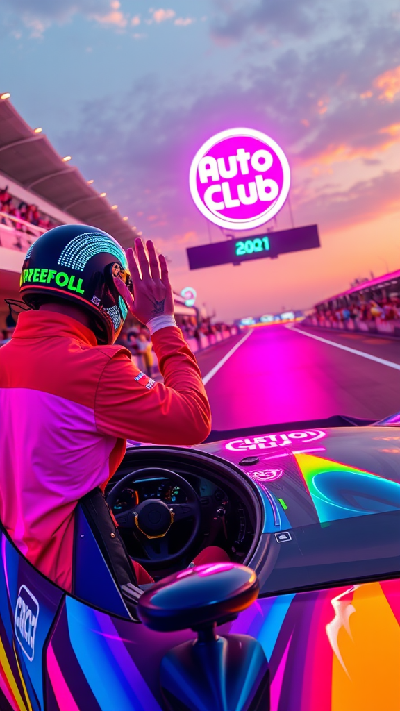 Summer day at the race track, a sleek car painted in vivid neon colors glows under a bright, holographic auto club logo. Beside it, a cybernetically enhanced racing driver adjusts his augmented reality helmet, a cascade of digitized lights rippling across its surface, while waving to the cheering fans with his other hand. The carβs cockpit is conspicuously empty, no driver or helmet in sight, hinting at advanced AI control. Enthralled spectators fill the stands and gather behind the track's glowing boundary, some adorned with luminous tattoos and smart-glasses reflecting the vibrant scene. The perspective captures the action from the side, slightly above and in front, immersing the viewer in a bustling cyberpunk atmosphere.