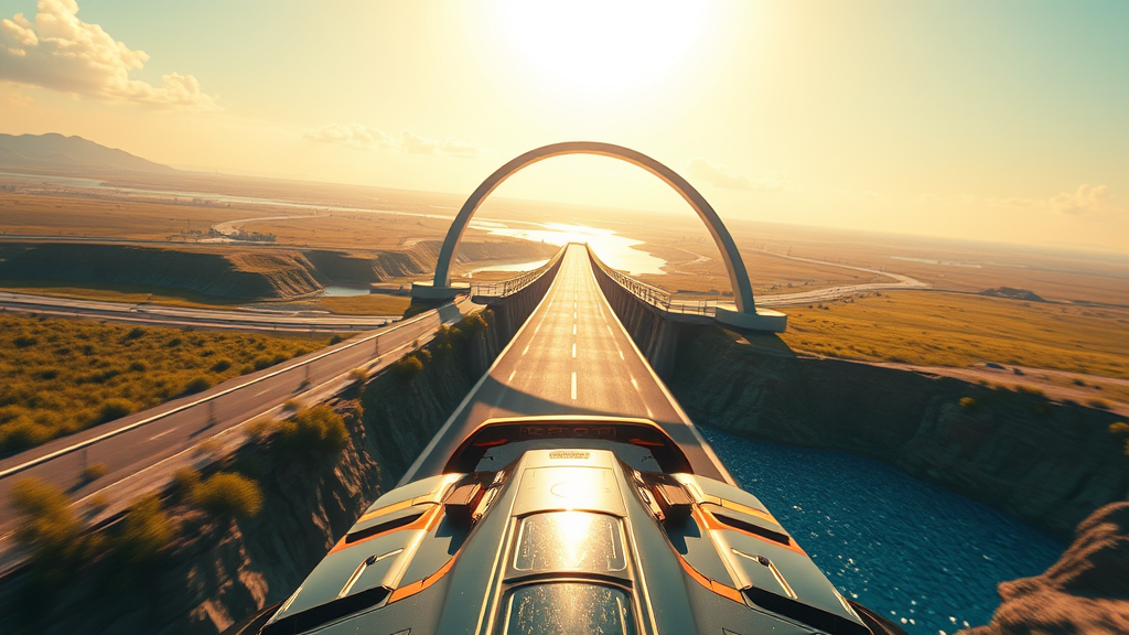Summer sun blazes down on the cyberpunk racing circuit as the route cuts through neon-lit fields, ascending towards the sleek Convex Bridge arcing over a shimmering blue river. The lead car surges forward, its metallic sheen glinting, but as it starts to climb onto the bridge, disaster strikes—a sudden malfunction on the track! No other bridges are in sight, and a gaping pit yawns ominously in front of the lead car. Beyond the bridge, the path dissolves into a haze of uncertainty and buzzing neon energy. The camera angles from behind and slightly to the side, capturing the tense moment as the raceway glows under the intense sunlight.