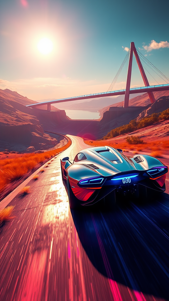 Summer sun casts vivid neon shadows on the racing circuit as the route threads through a shimmering virtual field and ascends dramatically to the futuristic Convex Bridge spanning a narrow river. The lead car, a sleek, chrome-clad machine pulsating with electric blue lights, begins its climb onto the bridge. Dread fills the scene—a system glitch on the track! There's no other structure in the panoramic sweep of the landscape. A massive neon-lit chasm looms menacingly before the lead vehicle, its depths aglow with an ominous crimson. The track, radiant under the relentless summer sun, fades mysteriously beyond the glitching bridge, leaving an uncertain path. The camera's gaze trails the car from a low angle, capturing both its rear and angular side, embodying a vibrant cyberpunk aesthetic with a tense aura of the unknown ahead.