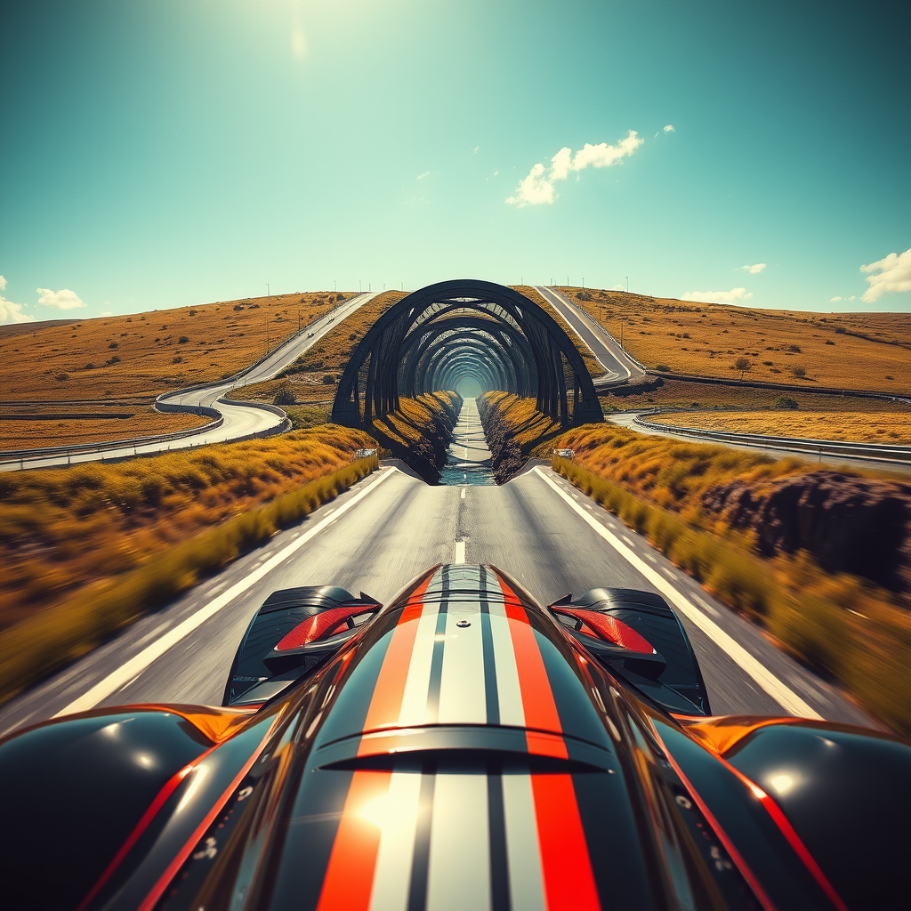 Summer. The highway stretches across a field and ascends to the Arched Bridge over a narrow stream. The lead car BEGINS to climb onto the bridge. Disaster! A gap on the highway! No other bridges in sight. In front of the leading race car, a large chasm is visible. Beyond the bridge, the rest of the track disappears from view. The camera perspective is from behind and slightly to the side of the car. The racing track is brightly illuminated by the sun. The style is cyberpunk.