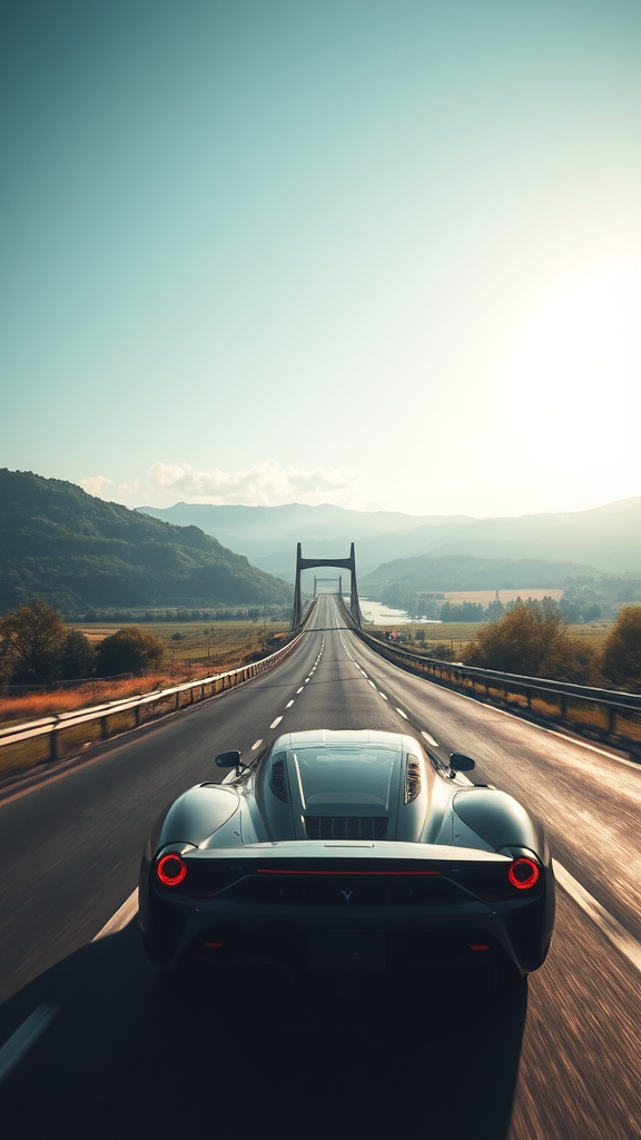 Summer. The highway stretches across a field, rising towards a Convex Bridge over a small river. The leading car BEGINS to ascend the bridge. Horror! A gaping hole suddenly appears in the highway! No other bridges are visible in the scene. In front of the leading race car, a massive chasm is evident. Beyond the bridge, the road disappears from view. The camera captures the scene from behind and slightly to the side of the vehicle. The racing track is bathed in sunlight. Style – cyberpunk.