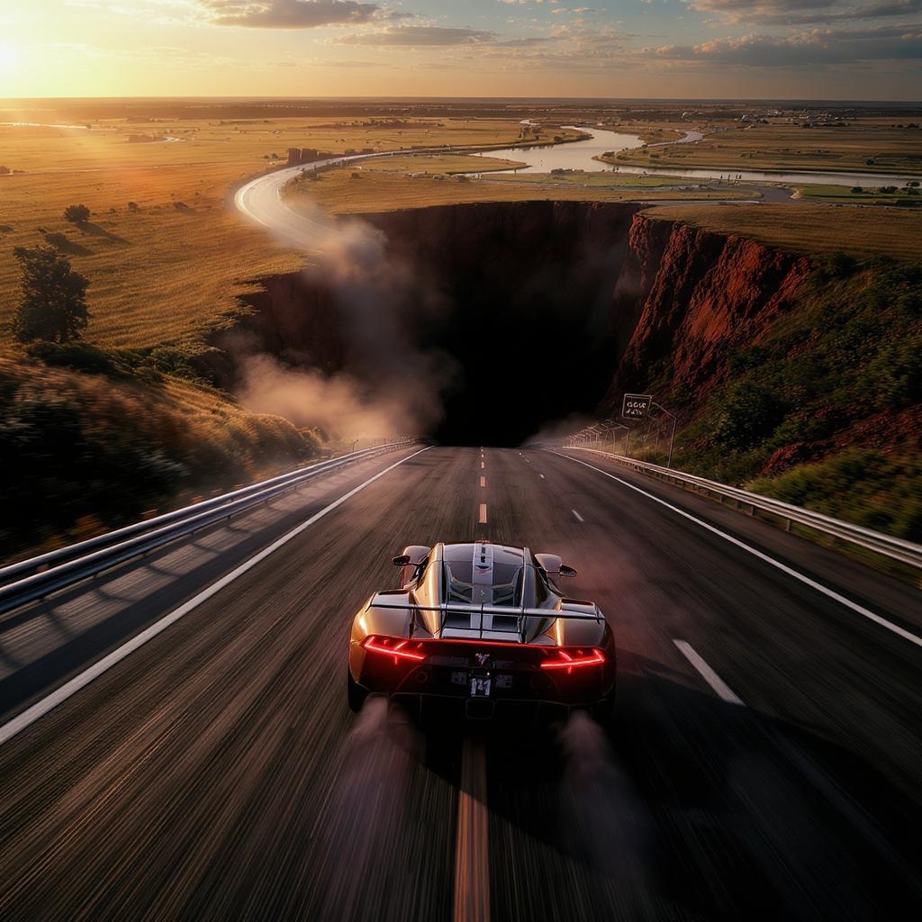 Summer. The highway stretches across the field, rising onto a convex bridge over a small river. The lead car begins its ascent up the bridge. Disaster strikes! A gaping void in the road! No other bridges are visible in the scene. Ahead of the lead racing car lies a massive chasm. The track beyond the bridge disappears from view. The camera angle captures the vehicle from behind and slightly to the side. The racing track is bathed in sunlight. The scene is stylized in a cyberpunk aesthetic.