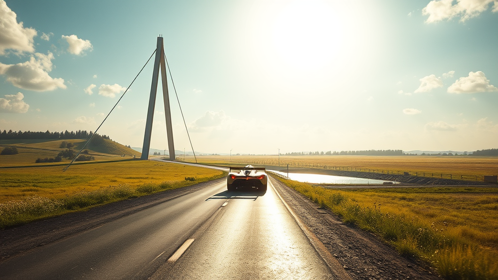 Summer. The road stretches across a sunlit field, ascending towards the Convex Bridge that spans a small river. The lead vehicle is just beginning its climb up the bridge. Horror! A gaping void has appeared in the track! No other bridges are visible in the scene. Ahead of the leading race car is a large pit, obscuring the continuation of the track beyond the bridge. The camera is positioned slightly behind and to the side of the vehicle. The race track glimmers under the bright sun, infused with a futuristic and dynamic cyberpunk atmosphere.