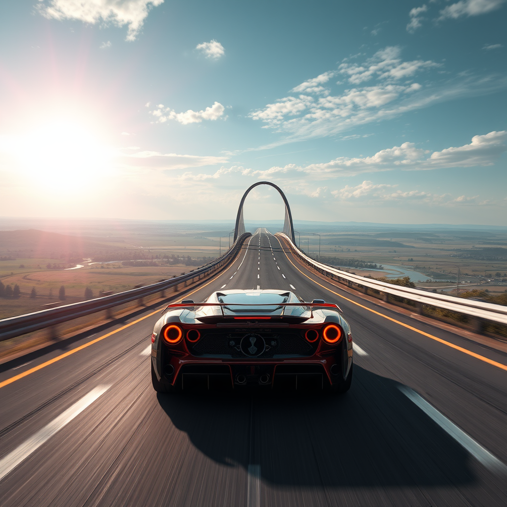 Summer unfolds across the horizon. A highway stretches over fields, ascending to arch over a Convex Bridge spanning a meandering creek. The leading car begins its climb onto the bridge, and suddenly, terror unfolds—a gaping chasm appears in the road! No other bridges are visible in the scene. In front of the leading race car, an enormous void looms. The road beyond the bridge vanishes from sight, obscured. The camera captures the scene from behind and slightly to the side of the vehicle, immersing us in the moment. The racetrack is bathed in vibrant sunlight, while the scene is infused with a cyberpunk aesthetic, marked by neon reflections and futuristic details.