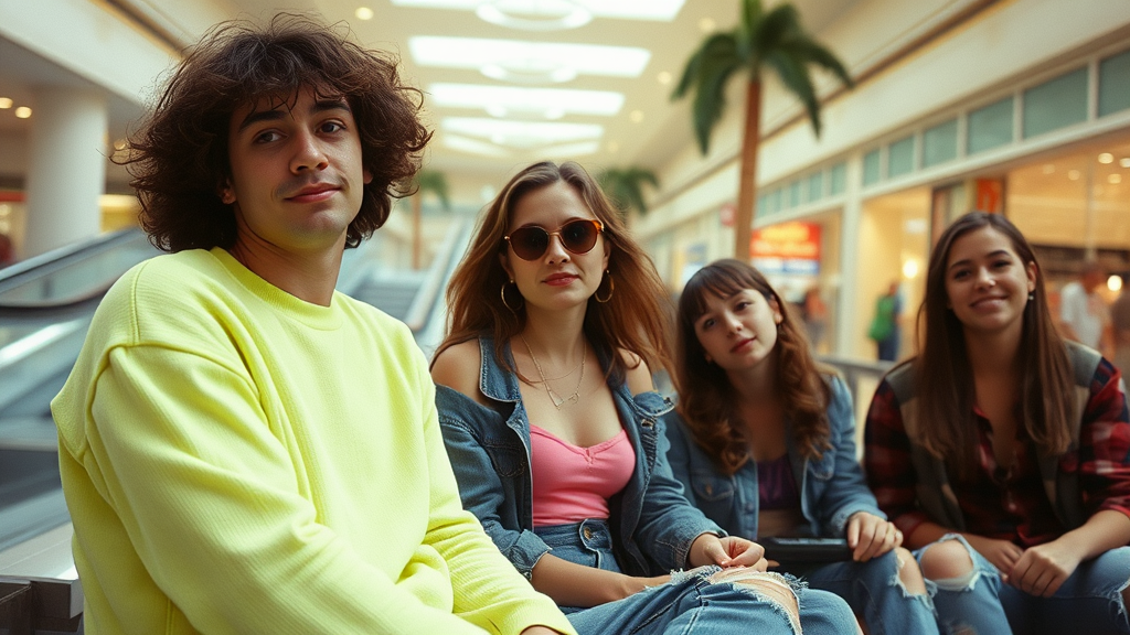 Summer vibes of 1995 revived, seen through the warm grain of VHS footage: Neon-clad teens laze on sunny mall courts, their Shibui sweaters and acid-washed jeans a testament to their rebellious spirit. In the background, glinting glass escalators slide between fluorescent-lit storefronts, while chalky Magnum ice cream vendors and greasy Sbarro's employees lazily mill around, caught in a haze of cigarette smoke and desperation. Distressed denim-clad poseurs immortalized on the Olive Garden patio, photobombing handmade Instamatic prints with flannel-clad friends, surrendering to joyful emotions and perfectly imperfect, raging beauty.