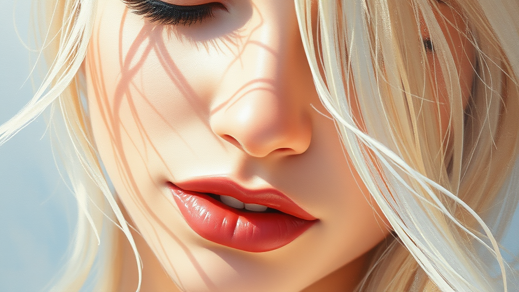 Summer's color by Catallia Vasquez painting, a whisper of silver white, intimate face close up, radiant warmth in delicate hues, ethereal light dancing across features, serene expression woven with soft highlights, gentle glow envelops the portrait, tranquil essence captured in each brushstroke, blending warmth and coolness, balanced in harmony, shimmering reflection of summer's embrace.
