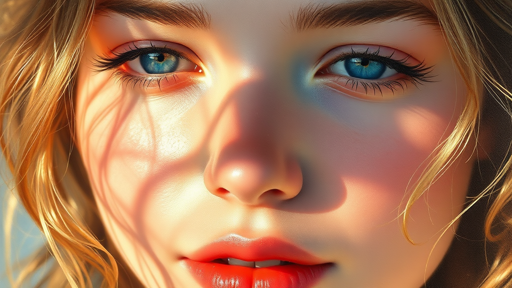 Summer's essence captured in a painting by Catallia Vasquez, with a close-up on a face bathed in the glow of soft silver white, evoking the warmth and brightness of the season, featuring delicate sunlit hues, with gentle highlights that touch upon every detail, imparting a sense of serene warmth and subtle vibrancy.