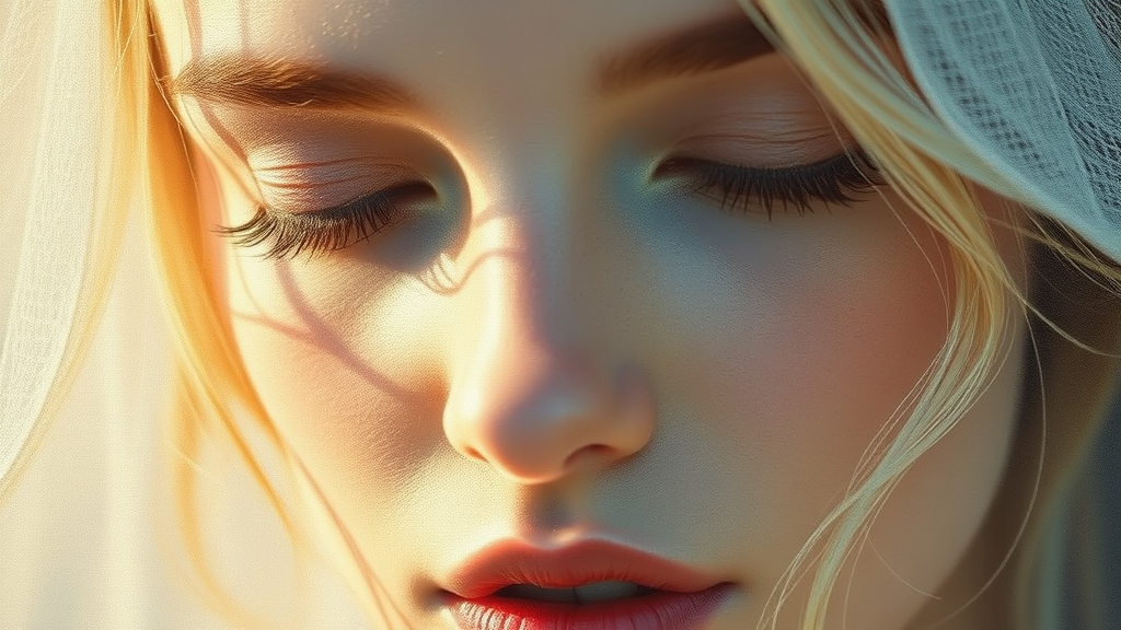 Summer's hue by Catallia Vasquez painting, a wash of delicate silver-white, close-up portrait, serene expression, soft blend of warm and cool tones, illuminated with gentle light, intricate texture, ethereal and luminescent ambiance, whisper of pastel colors, tranquility embodied in a serene visage.