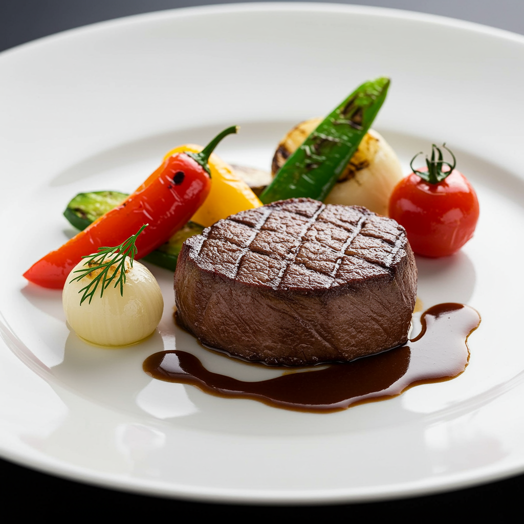 Sumptuous culinary photography of perfectly seared beef accompanied by an array of vibrant grilled vegetables, captured in the opulent style of a Michelin-starred kitchen, with exquisite studio lighting that highlights each detail and a sophisticated depth of field to accentuate the gourmet essence.
