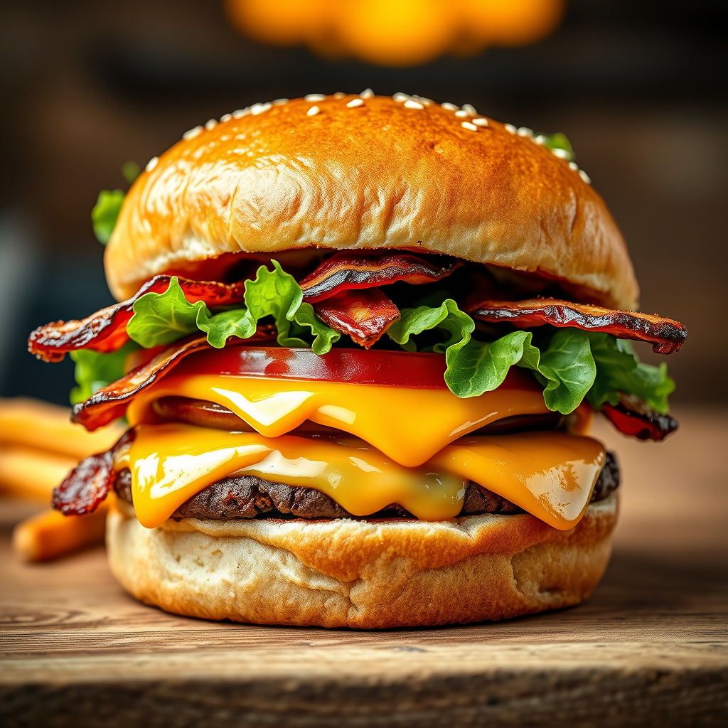 Sumptuous hamburger featuring crispy bacon, fresh lettuce, juicy tomato, and melted cheese; promotional image showcasing the product in hyperquality full-color, captured in an extreme render that's irresistibly mouthwatering.