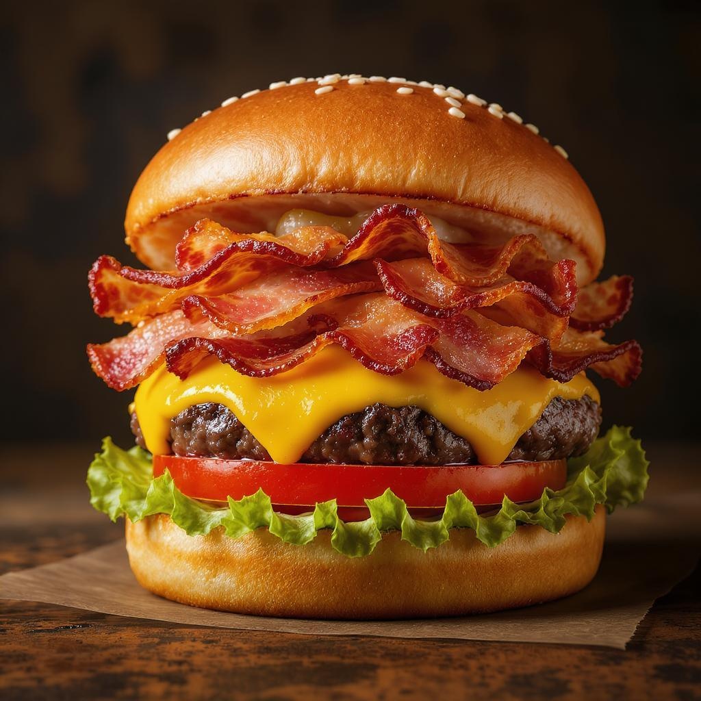 Sumptuous hamburger piled high with crispy bacon, fresh lettuce, ripe tomato, and melted cheese; promotional image showcasing high-definition quality; product shot with vibrant colors and exquisite rendering; an irresistible and tantalizing feast for the eyes.