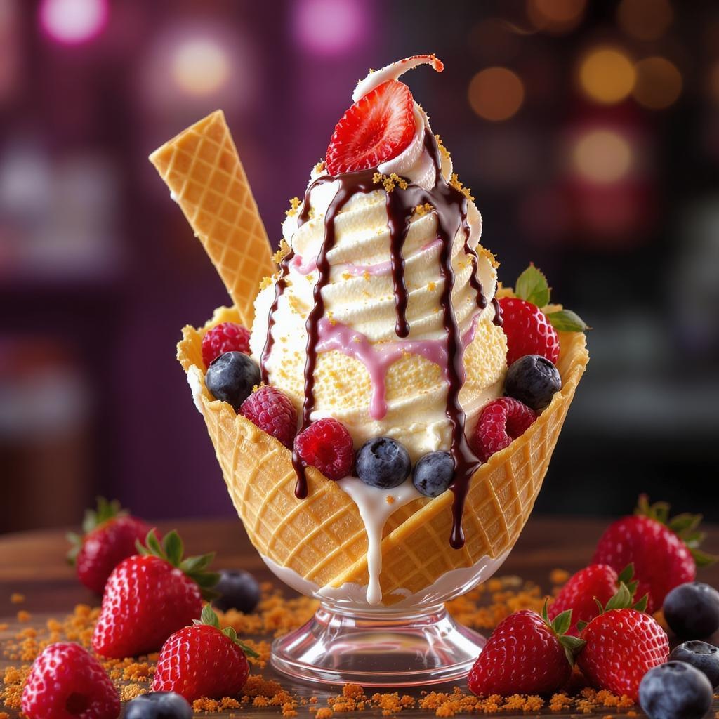 Sumptuous ice cream sundae nestled in a waffle cone bowl, adorned with fresh berries and a medley of toppings, UHD, HDR10, 16K, vibrant colors, striking resolution, extraordinary textures, surreal twists, intriguing elements, imaginative extension, surprising alterations, notable features, otherworldly charm, unexpected duplicates, eye-catching details, dreamlike vision, stunning presentation, artistic flair, whimsical touch, captivating allure, surreal enhancement, innovative composition.