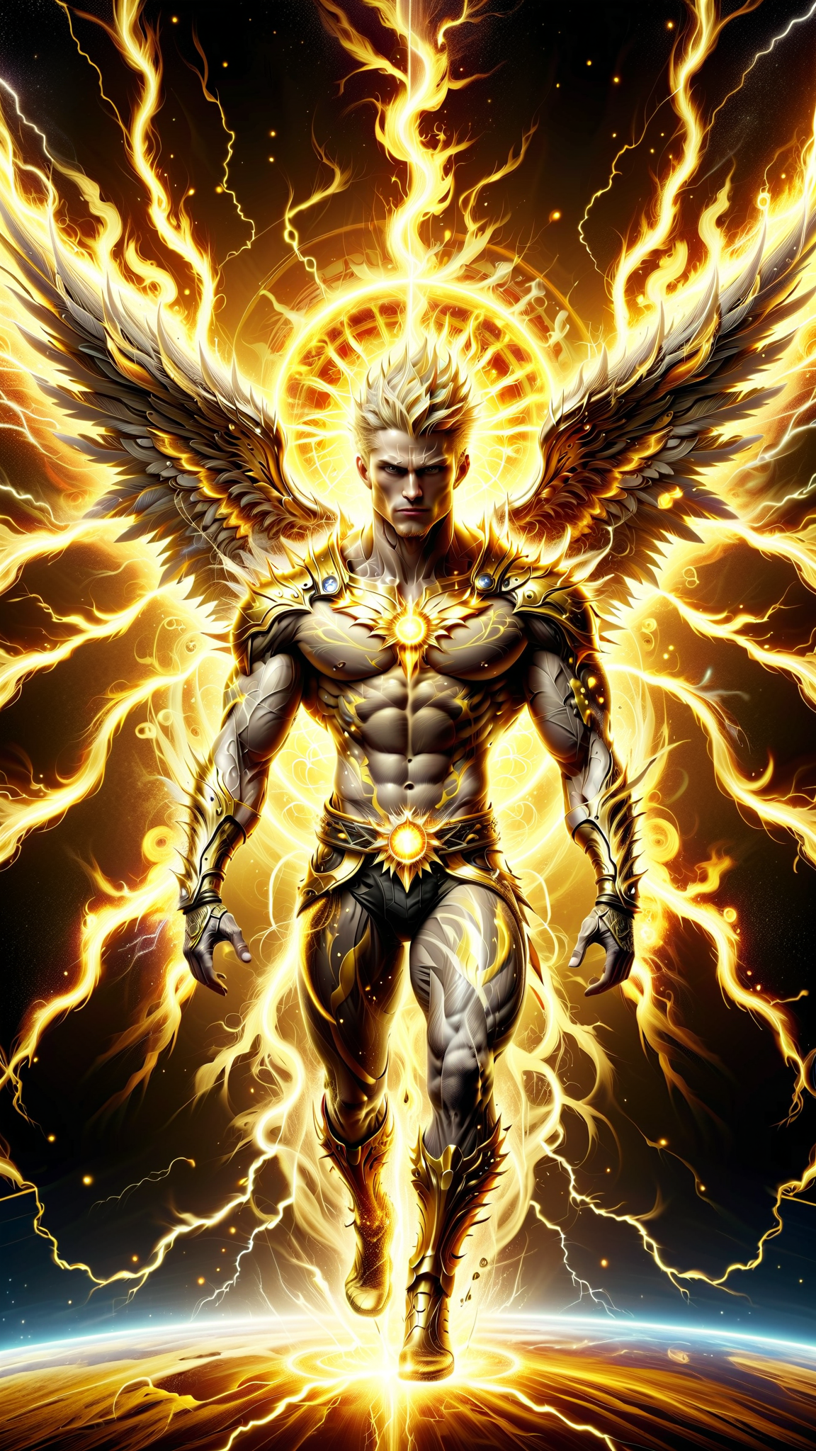 Sun Angel, cosmic being. An aura of yellow flames, shines like the sun, flying through space. Hypermasculine male. Tall, muscular, fit, sinewy, broad chest, wide back, narrow waist, strong legs, powerful arms, bodybuilder shape. Flaming yellow-gold skin, eyes that shine like gold stars. Strong brow and jaw, handsome. Very short flaming blonde hair, cut close on sides and back, spiky flames on top of head. Angel wings of yellow fire and flames. Metallic gold shoulder pads with glowing yellow glyphs; a belt with the same type of glyphs and a yellow topaz jewel in the center around his waist. Metallic gold bracers on his arms. Naked, aside from his jockstrap. Metallic gold jockstrap sheathing a large phallus. Knee-high metallic gold boots with glowing yellow glyphs. He flies around the sun. Full body pose.