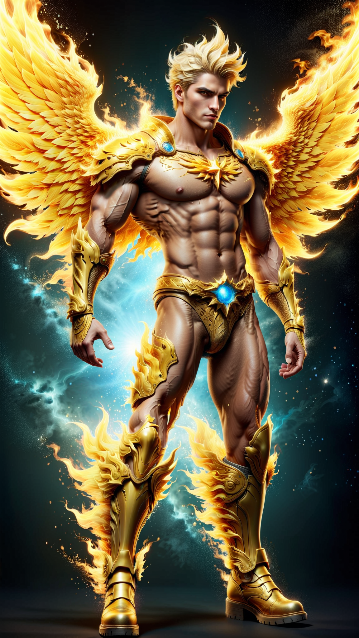 Sun Angel, cosmic being. An aura of yellow flames, shines like the sun, flying through space. Hypermasculine male. Tall, muscular, fit, sinewy, broad chest, wide back, narrow waist, strong legs, powerful arms, bodybuilder shape. Flaming yellow-gold skin, eyes that shine like gold stars. Strong brow and jaw, handsome. Very short flaming blonde hair, cut close on sides and back, spiky flames on top of head. Angel wings of yellow fire and flames. Metallic gold shoulder pads with glowing yellow glyphs; a belt with the same type of glyphs and a yellow topaz jewel in the center around his waist. Metallic gold bracers on his arms. Naked, aside from his jockstrap. Metallic gold jockstrap sheathing a large phallus. Knee-high metallic gold boots with glowing yellow glyphs. He flies around the sun. Full body pose.