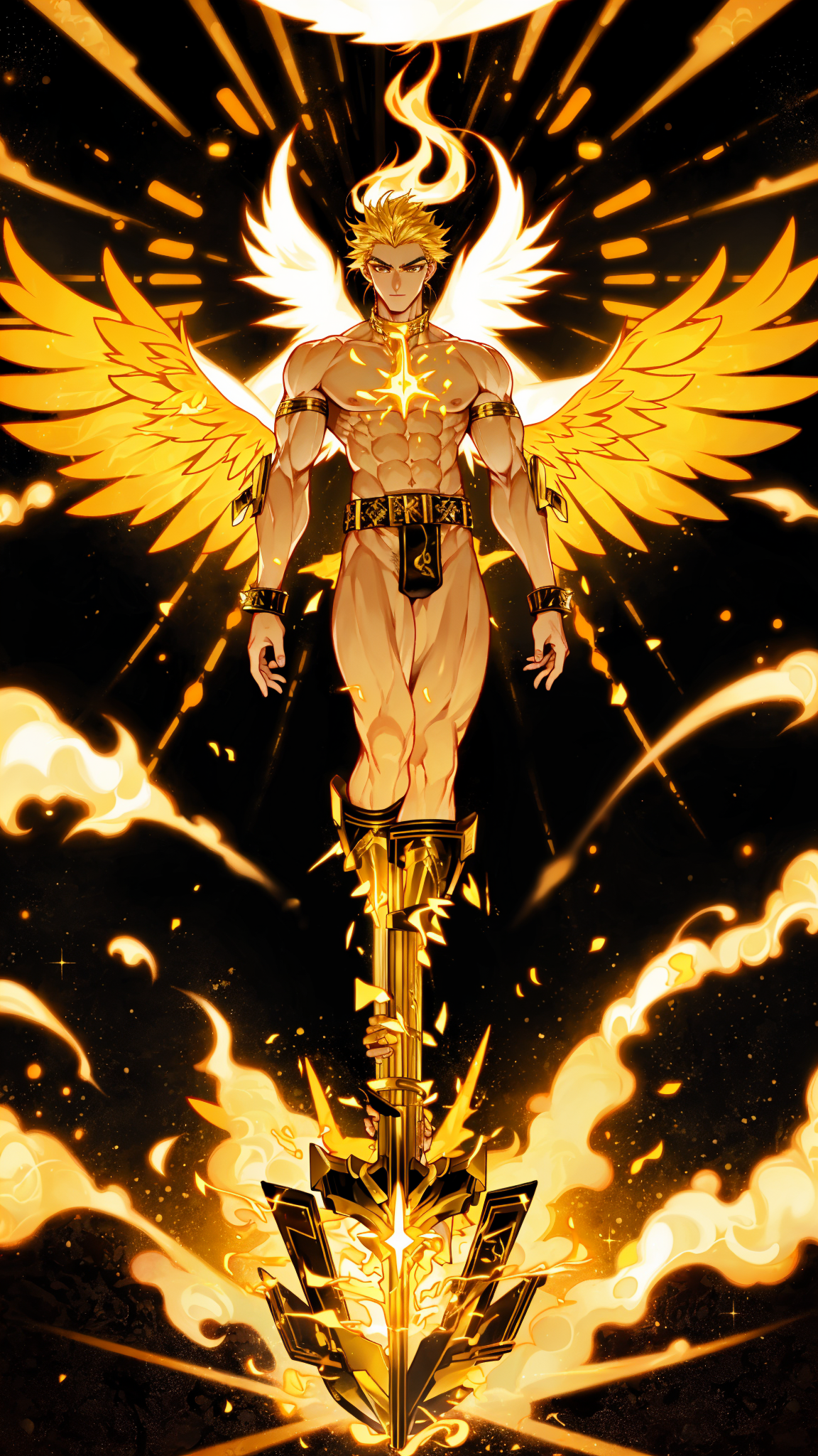 Sun Angel, cosmic being. An aura of yellow flames, shines like the sun, flying through space. Hypermasculine male. Tall, muscular, fit, sinewy, broad chest, wide back, narrow waist, strong legs, powerful arms, bodybuilder shape. Flaming yellow-gold skin, eyes that shine like gold stars. Strong brow and jaw, handsome. Very short flaming blonde hair, cut close on sides and back, spiky flames on top of head. Angel wings of yellow fire and flames. Metallic gold shoulder pads with glowing yellow glyphs; a belt with the same type of glyphs and a yellow topaz jewel in the center around his waist. Metallic gold bracers on his arms. Naked, aside from his jockstrap. Metallic gold jockstrap sheathing a large phallus. Knee-high metallic gold boots with glowing yellow glyphs. He flies around the sun. Full body pose.