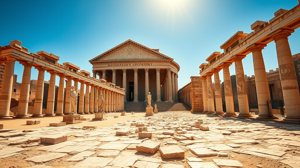 "Sun-baked marble colonnades vanish into the horizon, as the colossal dome of the Pantheon, a masterpiece of Imperial Rome's majesty, rises majestically into the stark blue sky. A raging sandstorm sweeps in, reducing the sprawling ruins to a distant mirage, as the camera's lense gazes out upon a seemingly endless expanse of cracked stone, weathered mosaics, and forgotten grandeur. Disintegrating frescoes, their bright hues muted by time and dust, hint at the vibrant artistry that once adorned these bygone halls. Forgotten statuary, their classical forms worn by the relentless assault of ages, stand sentinel amidst the crumbling grandeur, as the orantonian breeze whispers ancient secrets through the columns' fluted beauty. The scene, bathed in the fiery glow of late afternoon, suggests a civilization as impermanent as the shifting sands that devour the land, while the ultra-wide angle lens draws the viewer inexorably into the haunting majesty of this bygone epoch."