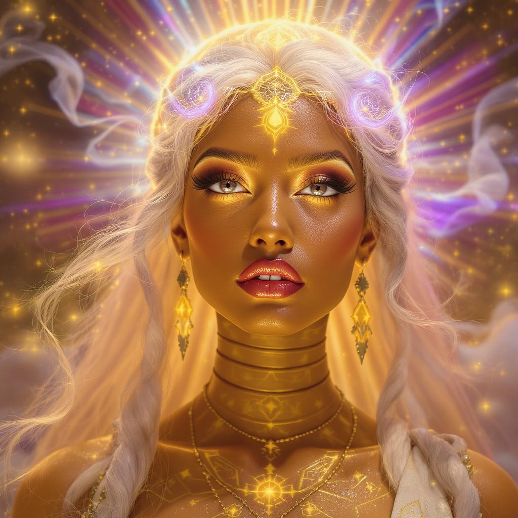 Sun goddess portrait, close up, heavenly aura, looking directly at the viewer with intent, exceptionally detailed and radiant skin. Captivating gradient colors surrounding her presence, heavenly atmosphere and intricate background elements. No visible watermark or signature. High-definition details, including HDR wires and elegant earrings. Her face has a natural, authentic touch with subtle imperfections. Expressive nose and enigmatic expression with a closed mouth. Cropped composition focusing on her intense gaze. Smooth, seamless image without blurriness, artifacts, or extraneous text. A striking depiction of divine beauty with an elongated neck, capturing an otherworldly essence.