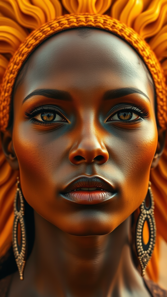 Sun goddess portrait, close-up, heavenly theme, highly detailed skin, direct gaze at the viewer, vibrant gradient colors, flawless background, divine atmosphere, mouth closed, intricate details, HDR textures, earrings adorning her, subtly imperfect and earthy face, prominent nose, artistically cropped composition, sharp clarity, devoid of text or signatures, unique and expressive character, elegant long neck.