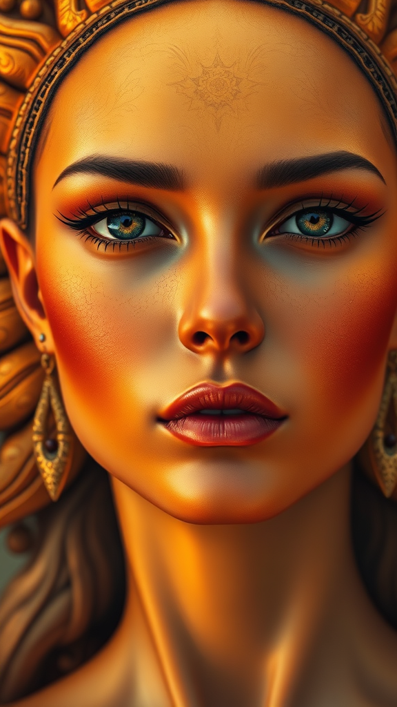 Sun goddess portrait close up, looking at the viewer with highly detailed skin and a stunning array of gradient colors, featuring a heavenly aura and closed mouth expression. The intricate background highlights her celestial presence, adorned with detailed ear rings and a touch of weathered beauty on her face. Her gaze is steady and serene, captivating in its intensity. Face is precisely defined, with a long graceful neck, the scene bathed in high dynamic range lighting that enhances the rich textures and vibrant hues.