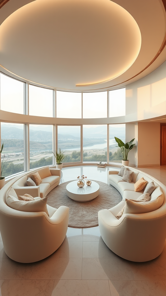 Sunken conversation pit living room with 70s-style retrofuturism interior design, featuring an imaginary 3D dreamy architecture render in 8k resolution. The space is highlighted by a soothing neutral beige color scheme, with soft ambient lighting and sleek, curvilinear furnishings. Large panoramic windows offer a view of a serene landscape, blending indoors with the outdoors. The design integrates touches of green with subtle plant accents, softening the minimalist yet cozy atmosphere.