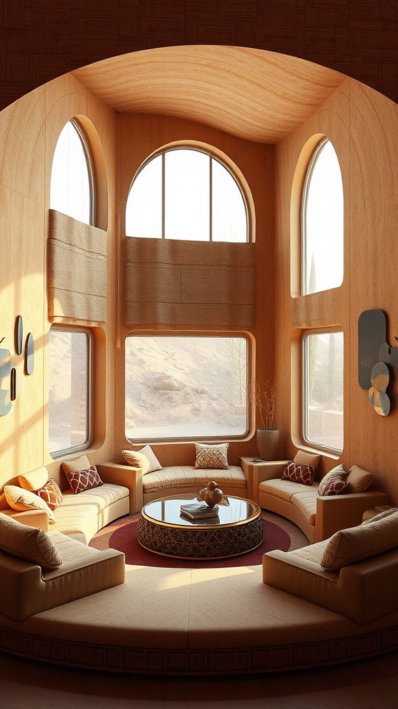 Sunken living room conversation pit 70s, retrofuturism interior design, imaginary 3d surreal 8k architecture render, warm earth tone color palette, large arched windows casting soft light, plush seating with geometric patterns, abstract wall art accents, futuristic lighting fixtures glimmering gently, organic curved elements harmonizing with sleek lines and textures, creating an inviting and nostalgic atmosphere.