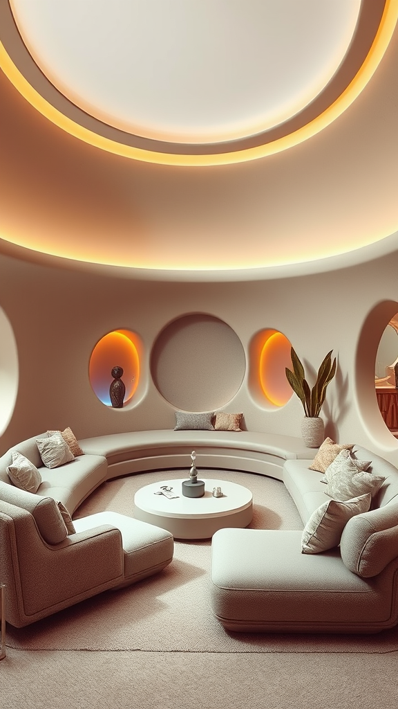 Sunken living room conversation pit 70s, retrofuturism interior design, imaginary 3d dreamy high-resolution architecture render, earthy beige and muted pastel color scheme, sleek curves and rounded edges, soft ambient lighting, futuristic vintage elements, plush seating with textured fabrics, abstract geometric decor.