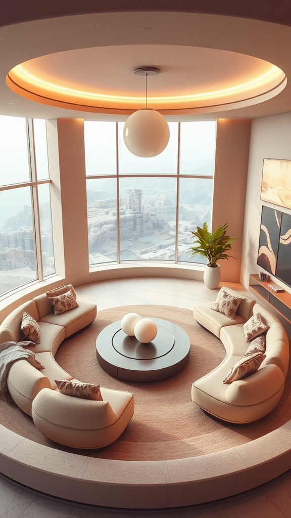 sunken living room conversation pit with 70s retrofuturism interior design, featuring an imaginary 3d dreamy architecture render in 8k resolution, soft pastel color palette with shades of beige and muted earth tones, circular seating around a geometric center table, ambient lighting from spherical fixtures, walls adorned with abstract art, large floor-to-ceiling windows offering a glimpse of a serene futuristic landscape, an inviting and ethereal atmosphere